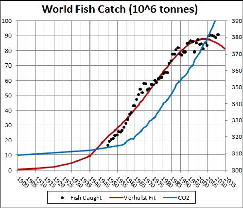 Note that the inflection year for fish catch, 1967, occurs shortly after the CO2 concentration starts climbing rapidly.