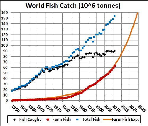 When wild-fish catching began to level off at ~1990, fish farming accelerated: