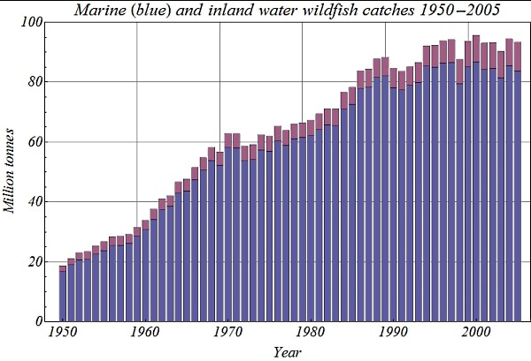 "Fish farming has dramatically increased in the last 15 years and has more than made up for the loss in production of ocean catch. At first it seems like a solution, and it is in part, but there are limitations. The pollution caused by the large populations of fish and shrimp raised in pens in estuaries is causing significant damage to the local ecosystem, particular in Thailand where there are heavy concentrations of shrimp farms. There is also the issue of food. At present a significant amount of food for raising fish consists of ground fish meal. To the extent that wild fish are caught and deliberately turned into meal to feed farmed fish, the system is counterproductive. It takes roughly 5lb. of fish meal to gain one pound of farmed fish, plus a lot of fuel and expense. At the same time the ocean fish are deprived of their food fish. Better to leave the fish in the ocean to be consumed by their natural predators and catch the larger fish. It is true that some of fish meal is made from byproducts of the fishing industry, but that is near its limit, so additional fish food will have to come from agriculture which is facing its own limitations."http://www.roperld.com/personal/InterdisciplinaryStudies.htm