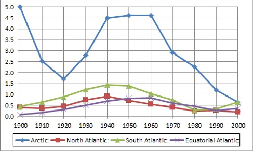 The data stop at year 2000, but it is claimed that phytoplankton density has decreased at ~1% each year since then. The phytoplankton data (fish food) and the assumed ~1% decrease for the Arctic Ocean, along with the fish catch, are: