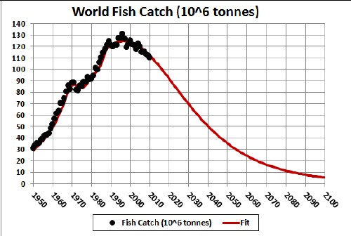 This is an attempt to fit the data for world ocean fish catches in order to project into the future. The data indicate that world ocean fishing has reached a peak. Fish farming is fast increasing to fill the gap.