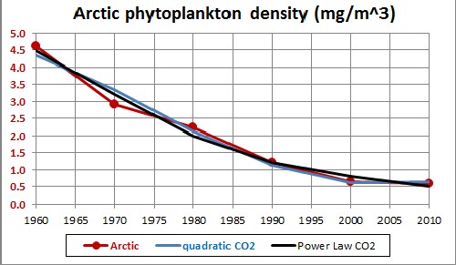 The following graph shows a quadratic and a power-law fit of the Arctic phytoplankton decline since 1960 to the CO2 concentration rise: