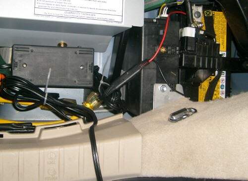 The black box on the left is the trickle charger. Its black double input wire and plug is left hanging out the back of the trunk. The red and black output wires to the auxiliary battery are shown on the right. If you do this, put a towel under the bolt that connects the negative wire of the battery to the chassis, so that you do not accidentally drop the bolt down in the gap behind the battery. Also, when you disconnect the battery, the alarm will sound in the car.
