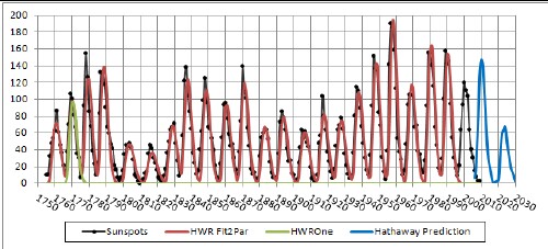 Hathaway, Wilson and Reichmann (HWR) created a parametrization for each cycle of sunspots for years 1755 to 1992. The equation for each cycle is