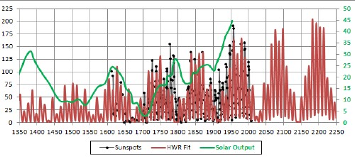 There is an earlier minimum in solar activity called the Spörer Minimum (1460-1550). The following graph shows a solar activity curve (in arbitrary units) and the sunspots prediction back to include the Spörer Minimum and forward to year 2250.