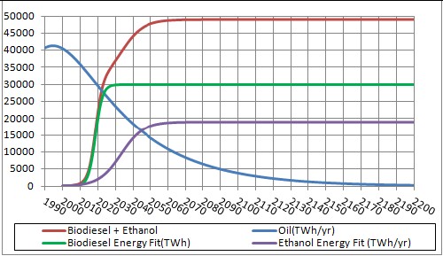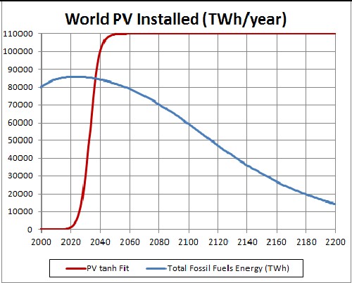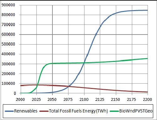 Note that the data used in the "Renewables" fit did not include biofuels and the BioWndPVSTGeo data did; also the "Renewables" data included wood and waste and the BioWndPVSTGeo data did not. Neither included hydroelectric power nor tidal energy. I would guess that the BioWndPVSTGeo needs to be increased by about 25% to include the remaining renewable energies. That would put the year 2200 projection at about 469,000 TWh, which would correspond to about 6.5 kW per person for 8.3x109 people. The current world average is about 2.5 kW/person. The "renewables" fit assume 12 kW/person.