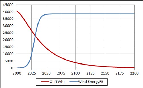 This shows the fit to the renewable-energy data for an asymptotical value of 900,000 Terrawatt-hours per year. |