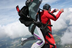 The whole-body force of the air is somewhat like belly flopping into a swimming pool from a high diving board, only it keeps on buffeting the body until the parachute is opened. (Afterwards I felt like fists had been pummeling my whole body in front.) I tried pushing my arms out, but that felt too unstable, so I kept them bent forward, which made my dive more stable that the flights of my three companions. I felt like my helmet was going to be pulled up off of me, so I put a hand on top of it part of the time; it should have been attached tighter.