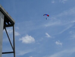 Shortly later Clarence told me to take the two parachute control straps with him and do a few turns. He did a 360° spin, which made me quite dizzy. We did a flare together by pulling down on both straps to spill air out of the chute for a moment of free fall. I am not sure how long it was from the time the parachute opened to landing; I think that it was about 5 minutes.