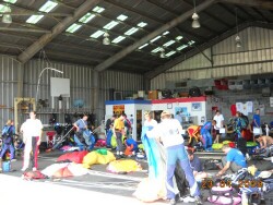 We drove to Middle Peninsula Airport in Mattaponi, Virginia next to the York River to join many other jumpers at West point Skydiving Adventures, arriving at noon. The company is located in a metal hanger to the left of a new airport terminal building. We stepped over many parachute lines where people were sitting and lying on the floor loading parachutes, also called canopies (similar to a rectangular parasail), into cloth back packs on our way toward the registration window in the back: