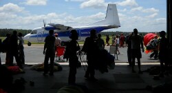 Finally, at about 1:30 we received detailed instructions from Henrik, who turned out to be Chris' instructor. We were fitted, after several tries for size, with jump suits and a massive harness, that has 4-point strong and tight connections to the harness of the instructor that would be behind us. The harness was so tight that it was difficult to walk to the plane and step up onto the rear ramp. We wore a wrist altimeter on the left arm and were instructed to watch it on the way down. There are two rip cords for the parachute, one of which is on a long extension that was hooked onto our harness. We were instructed to start to pull it at 6000 feet, so that the chute would be actuated at about 5000 feet. We wore a leather helmet with plastic goggles, which allowed me to keep my glasses on which I had secured with a strap behind.